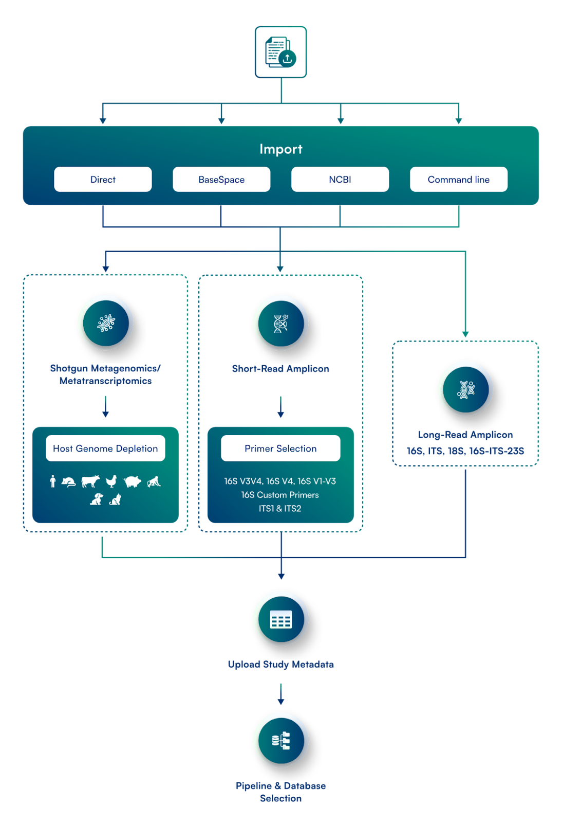 Researchers upload raw sequencing files (FASTQ, etc.)—from studies in fields like human health, nutrition, or environmental biology—using simple dashboard tools. Cosmos-Hub supports data generated from platforms such as Illumina, ONT, or others, accepting 16S, ITS, and shotgun metagenomic formats.